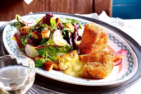 For the camembert, mix breadcrumbs, flour and herbs. Whisk the eggs. Quarter the camemberts. Turn each quarter twice first in the egg, then in the breadcrumb mixture. Heat 100 ml oil in a frying pan. Fry the cheese quarters for 5-8 minutes in portions until golden brown, turning once. Sprinkle salad with croutons. Serve everything.