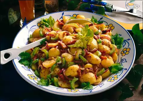 Add onions to the bacon and deglaze with broth and vinegar. Season with mustard, salt and pepper and add it to the potatoes, let it soak well. Clean the celery (put celery green aside for garnishing), wash and cut into fine slices.