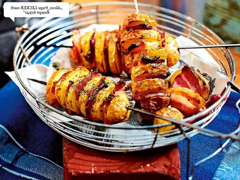 Cut the potatoes into slices about 1 cm thick. Put potato slices alternating with bacon on skewers.