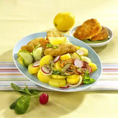 Turn the fillets one after the other in flour, egg and breadcrumbs. Fry in hot oil on each side until golden brown. Season with salt, pepper and lemon juice. Fry over medium heat for 3-5 minutes. Wash basil and parsley, pluck leaves, cut parsley into strips. Add bacon, sprouts and herbs to the potato salad. Season again and arrange with the cutlets. Serve garnished with lemon and cucumber butterflies