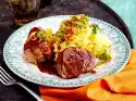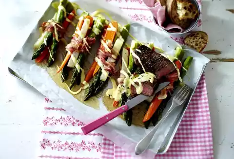 Finish the sauce hollandaise. Arrange vegetable parcels, meat and hollandaise sauce. Serve with baguette.