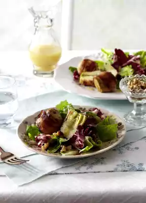 Clean, wash, shake dry and chop the salads. Mix salads, nuts and potato vinaigrette. Place artichokes on top.