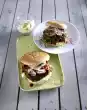 Cut onion into rings. Fry the bacon in a pan without fat until crisp. Drain on kitchen paper. Knead minced meat, mustard and egg yolk. Season with salt, pepper and paprika. Form 3 flat burgers. Grill in aluminium bowl while turning for 4-5 minutes. Cut the buns in half and place them on the grill with the cut surface for a few minutes. Remove the avocado from the skin, sprinkle with lemon juice and cut into slices. Spread the bottoms of the rolls with 1 tbsp. salad cream each. Cover with avocado, burger, 1 tbsp. each of ketchup, onion rings, bacon and parmesan. Finish with the lid