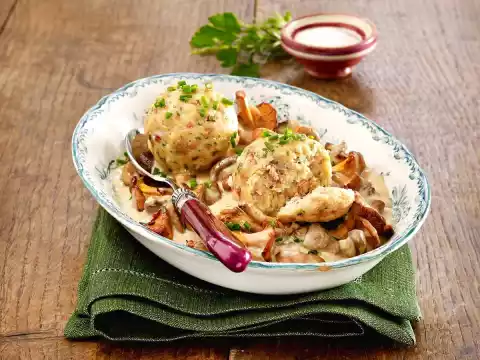 In the meantime, clean the mushrooms, wash them and possibly halve them. Mix plenty of water and 2 tablespoons of flour, briefly wash the chanterelles in it and drain well on kitchen paper. Peel and finely dice 1 onion. Heat the oil in a pan. Add the mushrooms and fry them for 4-5 minutes, turning them over. After 2 minutes add onions. Dust with 1-2 tbsp. flour and sauté briefly. Add stock, wine and cream while stirring and simmer for 4-5 minutes. Arrange mushroom ragout and dumplings, sprinkle with chives if necessary