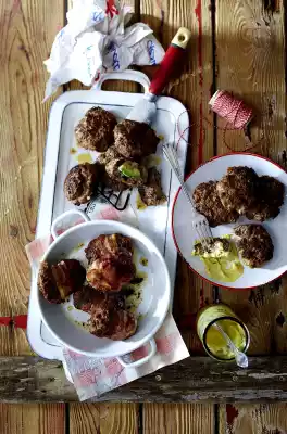 Form 8 meatballs with moistened hands. Wrap 1 slice of bacon around each. Press the ends of the bacon lightly. Heat 3 tablespoons of oil in a large pan. Fry the meatballs on each side for about 6-8 minutes until crispy.