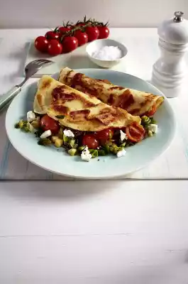 Coarsely crumble feta. Fill 2 pancakes each with the tomato filling, sprinkle with feta, fold up and arrange on a plate. Serve immediately.