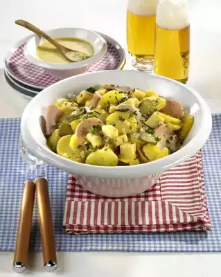 Wash the potatoes, bring to the boil covered with water and cook for about 20 minutes. Drain potatoes, rinse under cold water and peel. Peel and finely dice onions. Bring the stock to the boil. Add onions and simmer for about 2 minutes. Cut potatoes into slices and pour the hot stock over them. Mix oil, mustard and vinegar and fold into the potato slices. Cut sausage into thin slices, cheese into small cubes and cucumber into slices. Add sausage, cheese and gherkins to the potatoes and fold in carefully. Leave to stand for approx. 1 hour. Season to taste with salt and pepper. Wash the chives, dab dry, cut into small rolls and sprinkle over the potato sausage salad