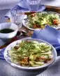 Pour vinaigrette over it. Wash parsley, dab dry and chop finely, except for a few leaves for garnishing. Wash lettuce leaves, drain and divide into 4 plates. Arrange sausage salad on top. Serve sprinkled with parsley and coloured pepper. Serve garnished with remaining parsley