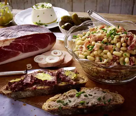 Served with farmhouse bread with Lyoner, Black Forest ham, canned blood and liver sausage with mustard and onion rings, gherkins and cream cheese with herb oil.