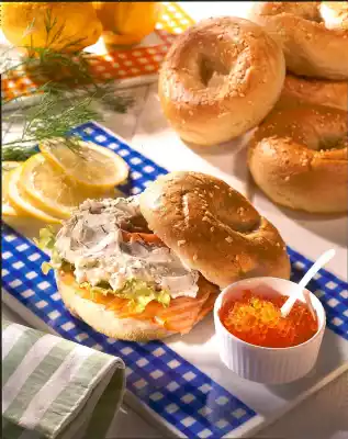 Wash the dill and chop finely. Peel onion and chop finely. Mix cream cheese, dill, onion and salmon cream until smooth. Season with pepper, lemon juice and horseradish. Cut the bagel open.