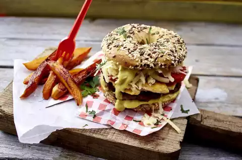 Cut the bagel. Spread the bagel halves with some dip, cover each with a meatball, a piece of omelette and tomatoes, sprinkle with cheese. Put a blob of dip on each, put a lid on and sprinkle with parsley.