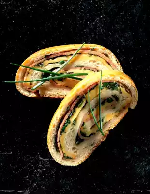Wash the chives, cut into fine rolls and sprinkle on the ham. Cover each pastry sheet with 3 slices of cheese and roll up from the narrow side. Place on a baking tray lined with baking paper.