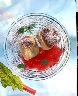 Bring rhubarb, sugar, sliced vanilla pod and 100 ml water to the boil and let it boil for about 5 minutes while stirring. Mix starch with some water until smooth and stir into the rhubarb sauce. Bring to the boil again briefly. Sprinkle the beans with cocoa and icing sugar. Let the sauce cool down and serve it to the pasties. Decorate with lemon balm as desired