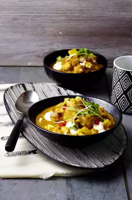 Add Bajun spice mix and 3 tablespoons of coconut milk to the pot. Bring to the boil. Cut remaining chilli pepper into rings. Fill curry into bowls and garnish with chili rings, cress and remaining coconut milk.
