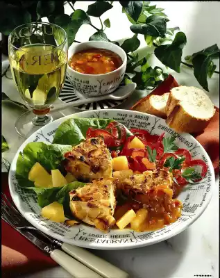 Arrange the lettuce, peppers and pineapple on 4 plates and arrange the camembert on top. Add some Asian sauce and garnish with parsley. Serve with fresh baguette