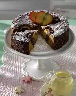 Cut half an apple into thin slices. Caramelise 1 tsp. sugar in a pan. Place the apple slices in the pan and add 1 tbsp water. Boil the caramel for 1-2 minutes, turning the apple slices from time to time. Dust the cake with icing sugar and decorate with apple slices