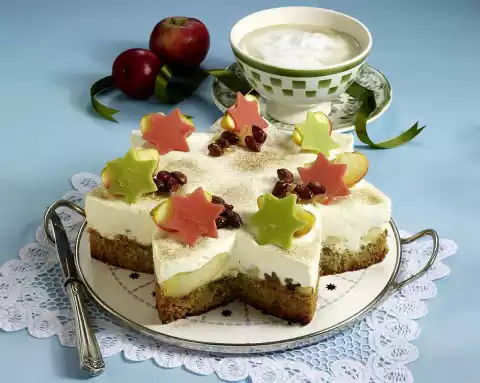 Soak gelatine in cold water. Whip the cream until stiff, adding 100 g sugar. Squeeze the gelatine and dissolve in warm water. Stir 1 tablespoon of sour cream into the gelatine. Quickly stir the gelatine and sour cream mixture into the remaining sour cream. Fold in the cream. Spread the cream and sour cream over the cake and chill for approx. 3 hours. Colour each 50 g marzipan with red or green food colouring. Roll out on a work surface sprinkled with icing sugar and cut out 7 stars. Boil 50 g sugar and 3 tablespoons of water. Add the almonds and simmer for 3-5 minutes until the sugar is slightly caramelised. Spread the almonds on a piece of baking paper and let them cool down. Cut remaining apple into seven slices, remove seeds and sprinkle with 1 tablespoon lemon juice. Remove the cake from the frame. Dab apple slices dry. Decorate the star with apple slices, marzipan stars and almonds. Dust with cinnamon sugar