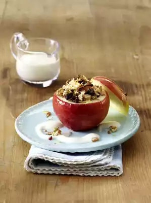 Place apples in an ovenproof dish and bake in a preheated oven (electric oven: 200 °C/ convection oven: 175 °C/gas: level 3) for approx. 15 minutes. Place the apple lids on the apples after half the cooking time.