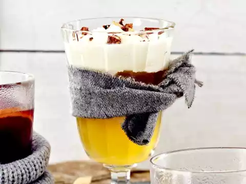 Heat cider, apple juice and almond syrup. Whip cream with vanilla sugar until stiff. Roughly chop the almonds.