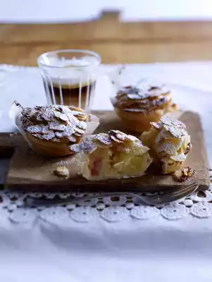 Take the puff pastry out of the refrigerator 5-10 minutes before processing. Grease 1 muffin tray (12 wells; each with approx. 90 ml content). Cut baking paper into 12 strips (approx. 4 cm wide, 12 cm long). Line each well with a strip. Unroll the puff pastry and roll it up again without baking paper. Cut into 12 snails. Press each snail flat on a floured work surface and roll out thinly in a circle (approx. 11 cm Ø). Lay out the hollows with the dough circles, press them on and chill