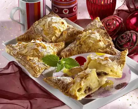 Place one half of each apple on a marzipan circle with the filling facing down. Whip the opposite corner of the dough over it to form a triangle. Press the edges well with a fork and cut straight if necessary.