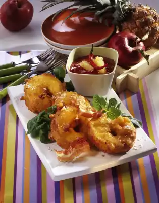 Do the same with the remaining apple rings. Then let them drip off a little on kitchen paper. In the meantime, cut the pineapple into small pieces and mix into the tomato chili sauce. Leave the bacon out in a pan without fat. Serve the apple rings and bacon on a plate with lamb's lettuce and lemon balm. Serve the sauce garnished with chilli pepper to taste