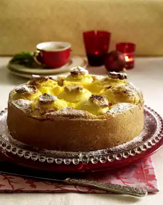 Pour marzipan-raisin mixture into the apples. Sprinkle the shortcrust pastry base with breadcrumbs, place the apples in it and let the custard run over it. Bake in the preheated oven (electric cooker: 175 °C/ convection oven: 150 °C/ gas: level 2) on the bottom shelf for 65-70 minutes. After about 25 minutes of baking time, cover the marzipan with small pieces of aluminium foil. Take the cake out of the oven, place it on a grid, let it cool down a little, remove it from the edge of the springform pan and let it cool down in the pan. Remove from the mould, dust the rim with icing sugar and arrange. Whipped cream tastes good with it