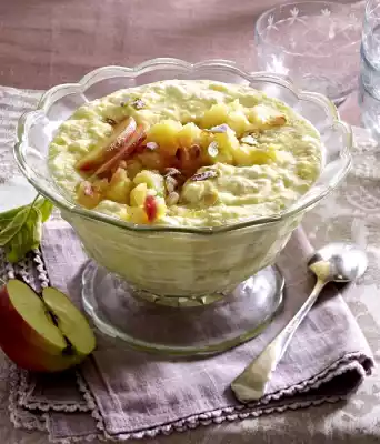Beat the cream and egg whites separately with the whisks of the mixer until stiff. With the egg whites, pour in 1 heaped tbsp. sugar. Fold the pudding, cream and beaten egg white into the cold apple compote in portions one after the other.