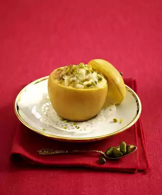 Wash apples and grate them dry. Coarsely chop the pistachios. Cut a lid off the apples. Hollow out apples with a ball cutter so that only a narrow edge remains. Drizzle apples with lemon juice