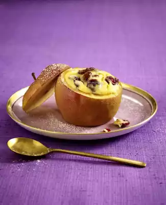 Place apples in an ovenproof dish and bake in a preheated oven (electric cooker: 200 °C/ convection oven: 175 °C/ gas: level 3) for 30-35 minutes. Put the apple lids into the pan halfway through the cooking time. Arrange baked apples on plates. Dust with icing sugar and serve warm