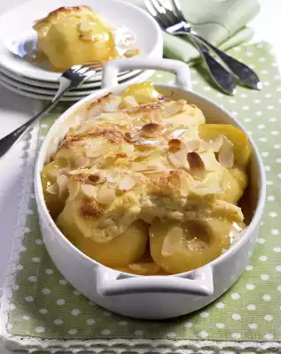 Beat egg whites until stiff, fold in carefully. Put semolina foam on the apples, sprinkle with almonds and 1 tablespoon of sugar. Bake in the oven at the same temperature for 10-12 minutes.