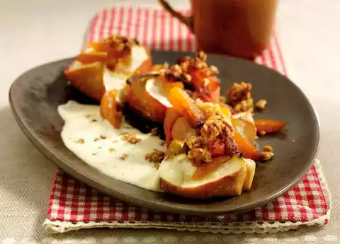 ##Apples## wash, quarter, core and sprinkle with lemon honey. Place in a greased ovenproof dish and spread the muesli mixture on top. Bake in a hot oven for 15-18 minutes.