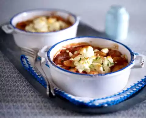 Divide into four small ovenproof moulds or one large mould. Crumble the cheese on top. Bake in a hot oven for 8-10 minutes. Flatbread tastes good with it.