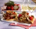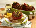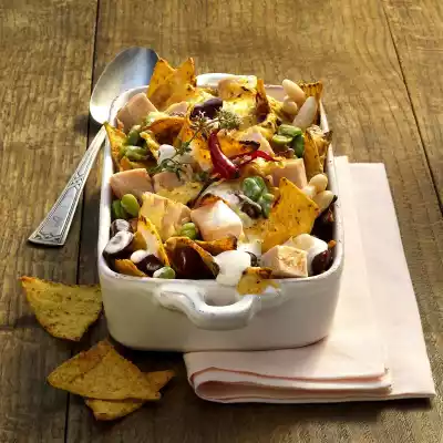 Peel the garlic and press it through a garlic press. Mix crème fraîche, milk and garlic, season with salt and pepper. Cut meat into cubes. Mix chips, meat and beans and fill into a greased casserole dish. Spread dip over it, sprinkle with cheese. Bake in a preheated oven (electric cooker: 175 °C/ convection oven: 150 °C/ gas: level 2) for approx. 10 minutes. Garnish with chilli pepper and thyme