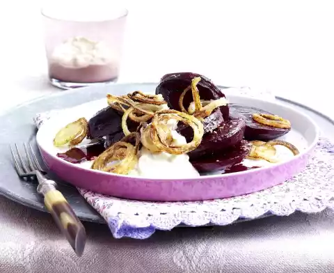 Arrange the finished beetroot with dip and onion rings on plates. Season with freshly ground pepper.