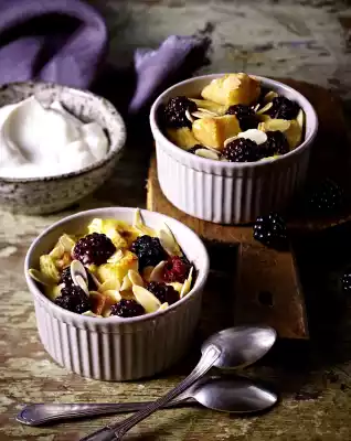 In the meantime, select the blackberries and wash if necessary. Preheat oven (electric cooker: 175 °C/circulating air: 150 °C/gas: see manufacturer). Grease six ovenproof moulds (each approx. 8 cm Ø). Spread the bread mixture into the ramekins.