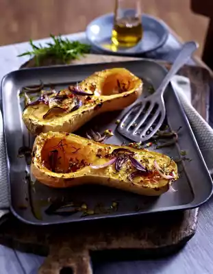 Spread the pumpkin on a small baking tray or an ovenproof casserole dish. Season with salt and sprinkle with the remaining ingredients. Sprinkle with oil. Bake in a preheated oven (electric cooker: 200 °C/ convection oven: 175 °C/ gas: see manufacturer) for approx. 45 minutes