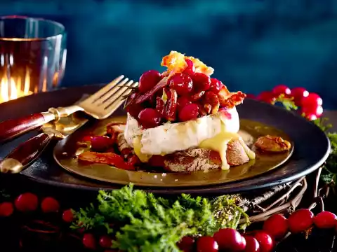 Preheat oven (electric cooker: 200 °C/circulating air: 180 °C/gas: see manufacturer). Line a baking tray with baking paper. Toast the slices of bread and cut them in half crosswise. Spread the camemberts on the halved bread slices. Place on the baking tray. Bake in a hot oven for about 12 minutes. Take out, arrange on plates with chutney and nuts, break bacon into pieces and spread on top.