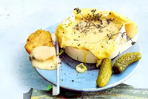 Cut the bread into thin slices. Peel and halve the garlic and rub the bread slices vigorously with it. Heat clarified butter little by little in a pan. Fry the bread in it in portions until golden brown. Remove the cheese. Serve with cucumbers and baguette to dip into. Boiled potatoes and Black Forest Ham for non-vegetarians are also delicious.
