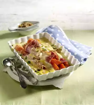 Wrap 2-3 carrots in 1 ham slice each. Divide into four small casseroles or one large dish. Pour cheese sauce over it. Grate Gouda. Sprinkle with almonds over the carrot rolls.