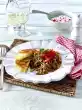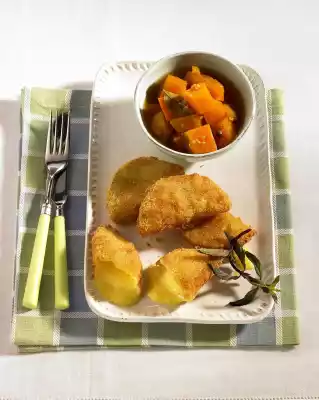 Turn cheese slices first in the flour, then in the egg milk and finally in breadcrumbs. Press the breadcrumbs well. Heat the oil in a large pan. Fry the cheese for 1-2 minutes on each side until golden brown. Let it drip off on kitchen paper. Serve immediately with the pumpkin. Garnish with mint