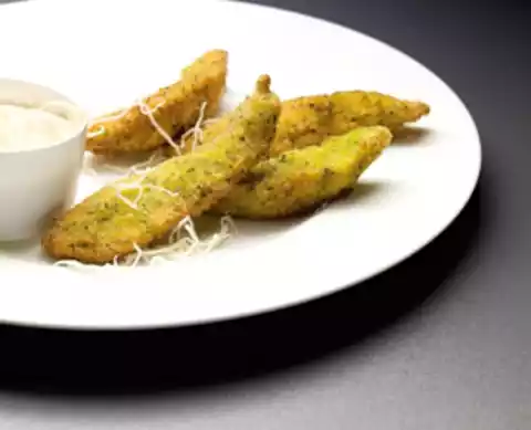 Pull the floured strips one by one first through the whisked egg, then through the parsley crumbs.