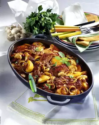 Add onions again, bring to the boil briefly. Season again with salt, pepper, dried oregano and ketchup. First the potatoes, then the chops in a suitable roaster. Pour the sauce evenly over them. Braise in the preheated oven (electric cooker: 200 °C/ gas: level 3) for about 1 hour. Serve garnished with fresh oregano