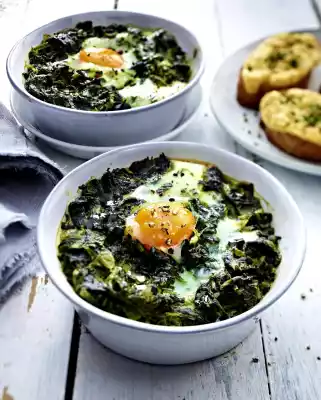 Preheat oven (electric cooker: 150 °C/circulating air: 125 °C/gas: see manufacturer). Crumble the gorgonzola and stir into the spinach. Season to taste with salt, pepper and nutmeg. Divide into four small casseroles.