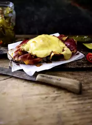 Add 1 tablespoon of oil to the hot pan. Carefully break 4 eggs and put them into the hot pan. Fry over low heat for approx. 1 minute until the egg white is firm. Turn the eggs, immediately cover with cheese and let them melt for a short time. Spread the eggs immediately on the ham slices. Season with pepper to taste. Gherkins and tomatoes taste great with it