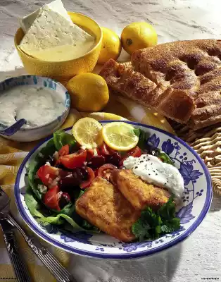 Whisk the egg, season. Turn the cheese first in the egg, then in breadcrumbs. Heat 2 tablespoons of oil. Fry the cheese on both sides until golden brown. Serve everything. Goes well with flatbread