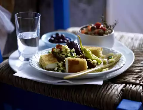 Heat 2-3 tablespoons of oil in a large frying pan. Fry the cheese for 4-5 minutes until golden brown. Season date salad to taste again. Serve with the cheese. Serve with pepperoni, olives and flatbread.