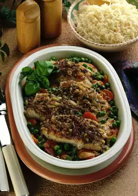 Mix cheese, breadcrumbs and herbs and spread on the fish. Bake in the preheated oven (electric: 200 ° C / gas: level 3) for about 15 minutes until golden brown. Garnish with parsley and basil.