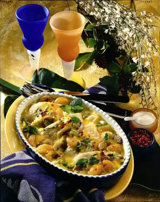 Stir 2 tablespoons of juice into the sauce. Clean and wash the spring onions and cut them into fine rings. Clean, wash and slice the mushrooms. Add mandarin oranges, spring onions and mushrooms to the sauce.