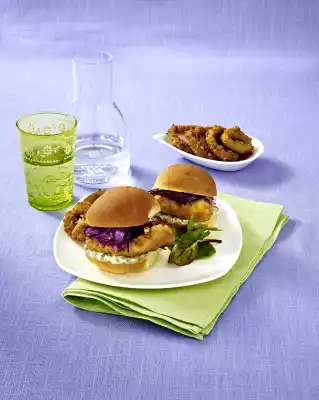 Drain fish on kitchen paper, keep warm. Fry onion rings for 2-3 minutes until golden brown. Halve the rolls and spread with the tartar sauce. Add the fish, then spread the red cabbage salad on top. Arrange the fish burger, onion rings and possibly some salad